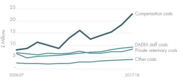 5. The Department’s eradication programme cost the government around £44 million in 2017-18. This covered the cost of testing and compensation (paid at 100 per cent of market value for cattle compulsorily removed). Farmers also bear considerable costs of programme compliance, including the cost of facilitating testing and costs associated with loss of their OTF status should they become a TB breakdown herd.