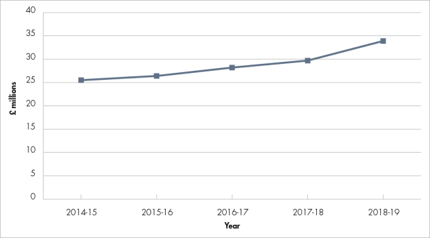 14. Payments of IoD awards are increasing for both schemes. This restricts spending elsewhere in the budget. It is difficult for the PSNI and Prison Service to forecast their cash spend on IoD awards each year, given that other bodies are responsible for the administration of the schemes and for the appeals process. In 2018-19 the PSNI made payments of £33.9 million (see Table 3) and the Prison Service £2.3 million (see Table 4), reflecting cost increases of 32 per cent over the last 5 years for the PSNI and 283 per cent for the Prison Service.