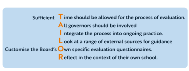 A process should be in place for the self-evaluation of individual governors and the collective Board of Governors, to identify areas for improvement and the action required to address these (see Part Five).